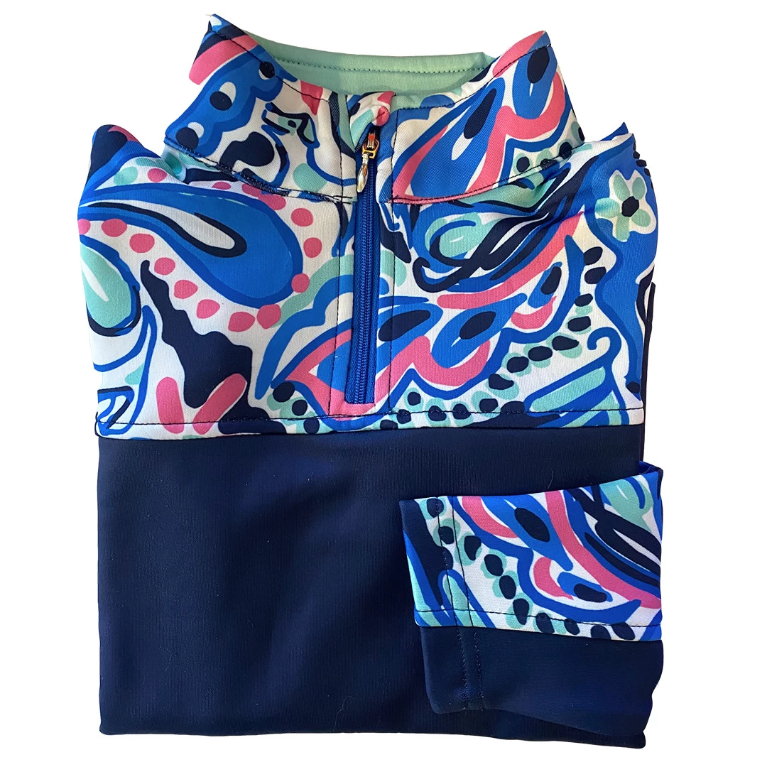 The ‘Jacks’ pattern is a clever dessign filled with ponies and Jack Russels! The shirt is Navy on the bottom and on the under sleeve patterns with the Navy/Pink/Mint/Blue pattern on the top/collar and sleeve uppers. The inside of the stand-up collar is mint.