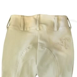 You’ll love the detailing and stretch fabric on these Belle and Bow jodphurs for younger riders. These front zip, Euro seat jods are just the right color tan and have darker brown suede knee patches. The waist band with belt loops is fashionably wide and is higher in back to keep shirts neatly tucked in.
