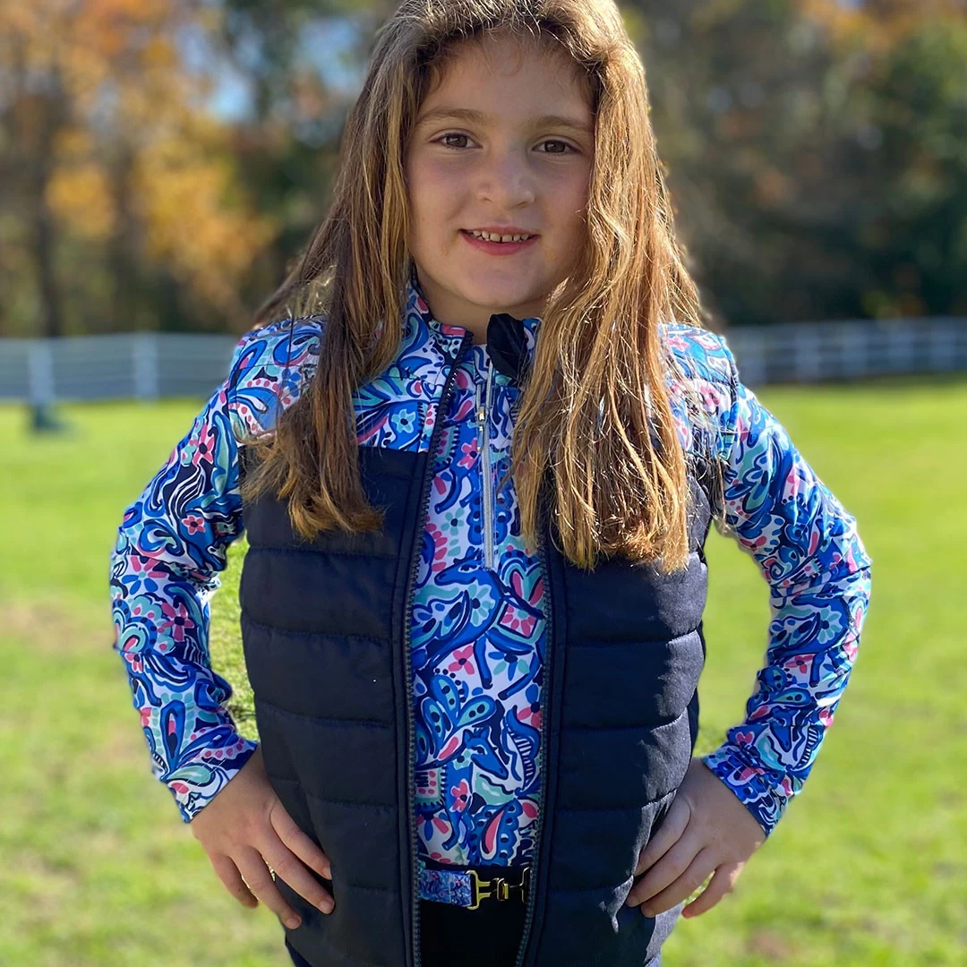 Available in tiny sizes, this technical top will keep your younger riders cool, comfortable and protected from the sun. The ‘Jacks’ pattern is a clever design filled with ponies and Jack Russells! The colors go beautifully together (navy, pink, blue & mint) and there are matching products including a vest, schooling jods, fleece top and show shirt!