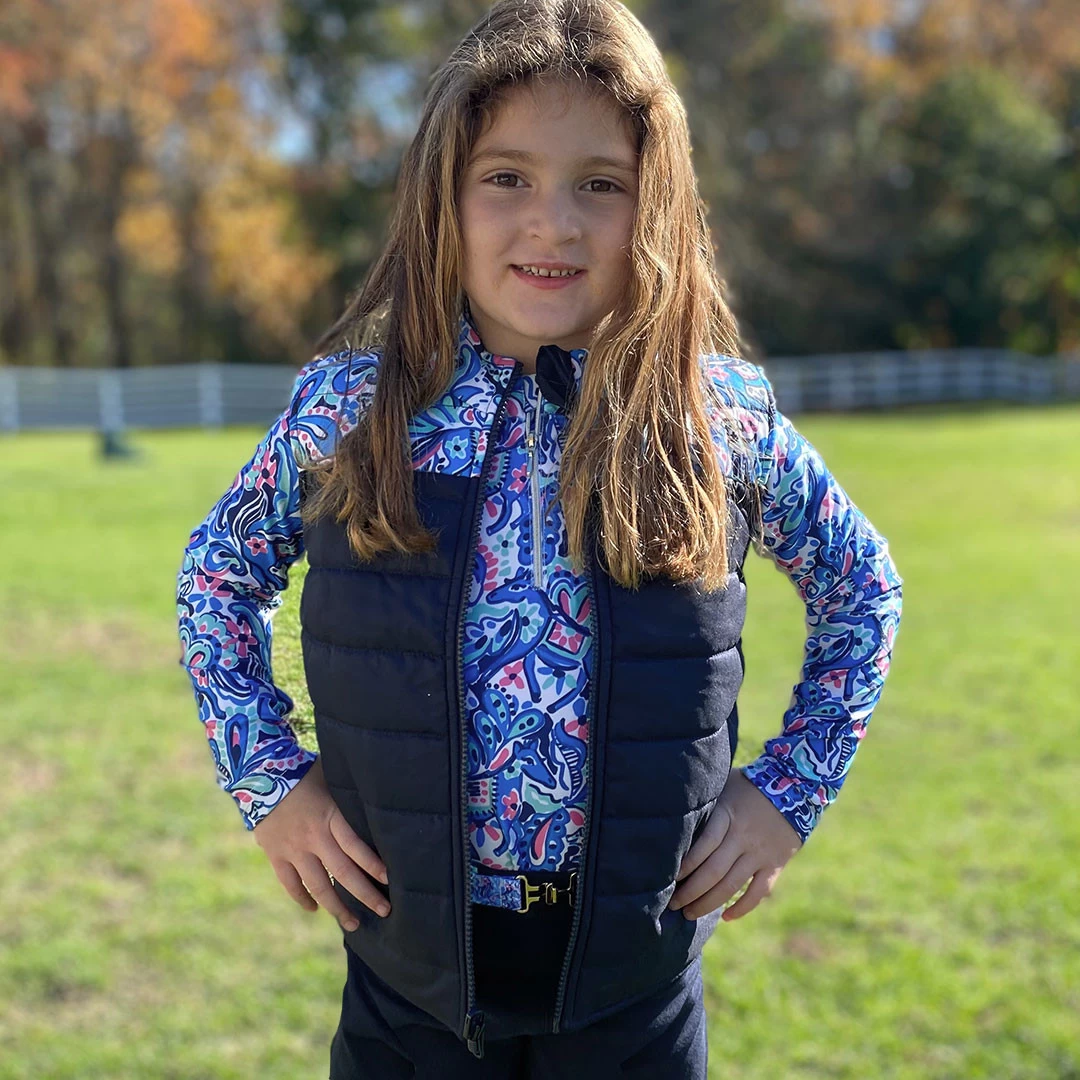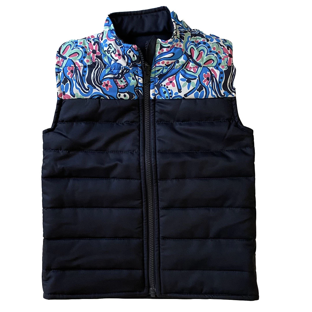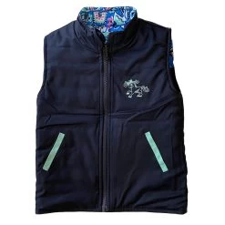 Perfect for the cooler weather or layering in winter, this reversible puffer vest is great for young riders. The vest is Navy with the Jacks pattern across the top, both front and back.The reverse side of the vest is also Navy with Mint trim on the pockets and an embroidered mint logo on the chest.