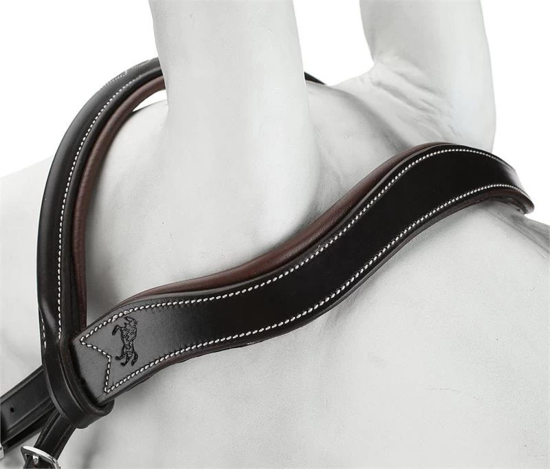 This bridle has a padded contour crown with no caveson strap going over the crown. There is a buckle for the caveson and throat latch on each side of the bridle.