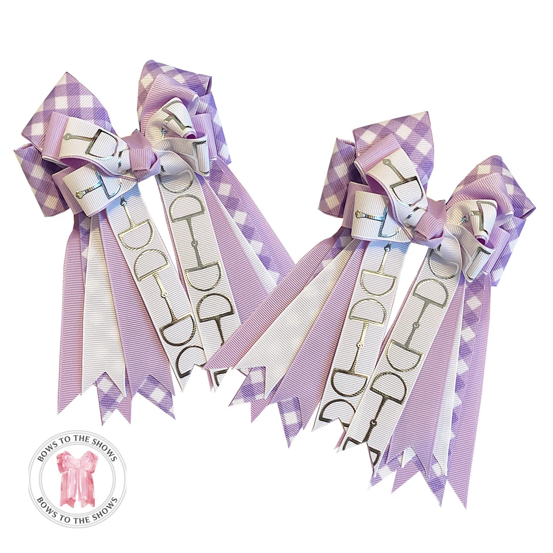 Color: Silver snaffles on White with Lavender, White & Lavender gingham ribbons