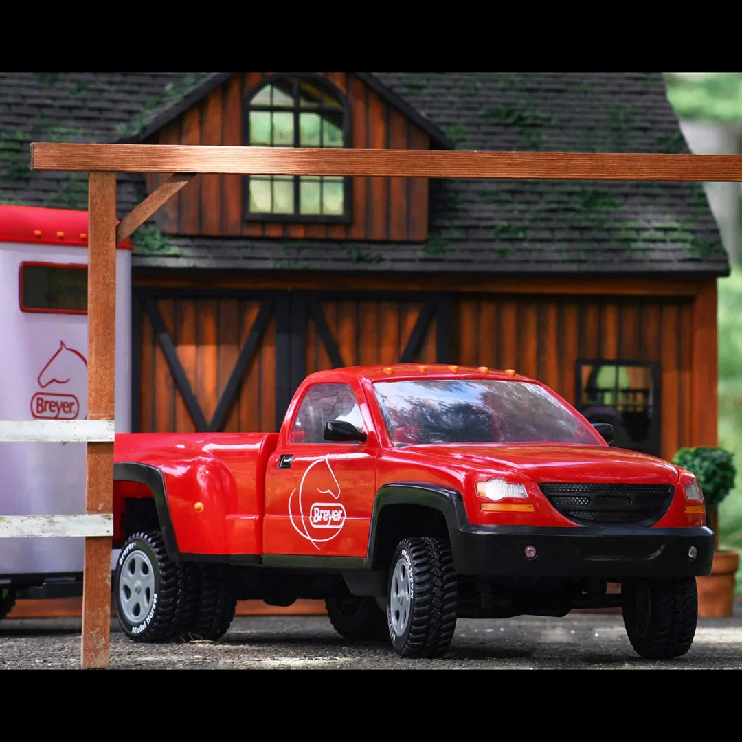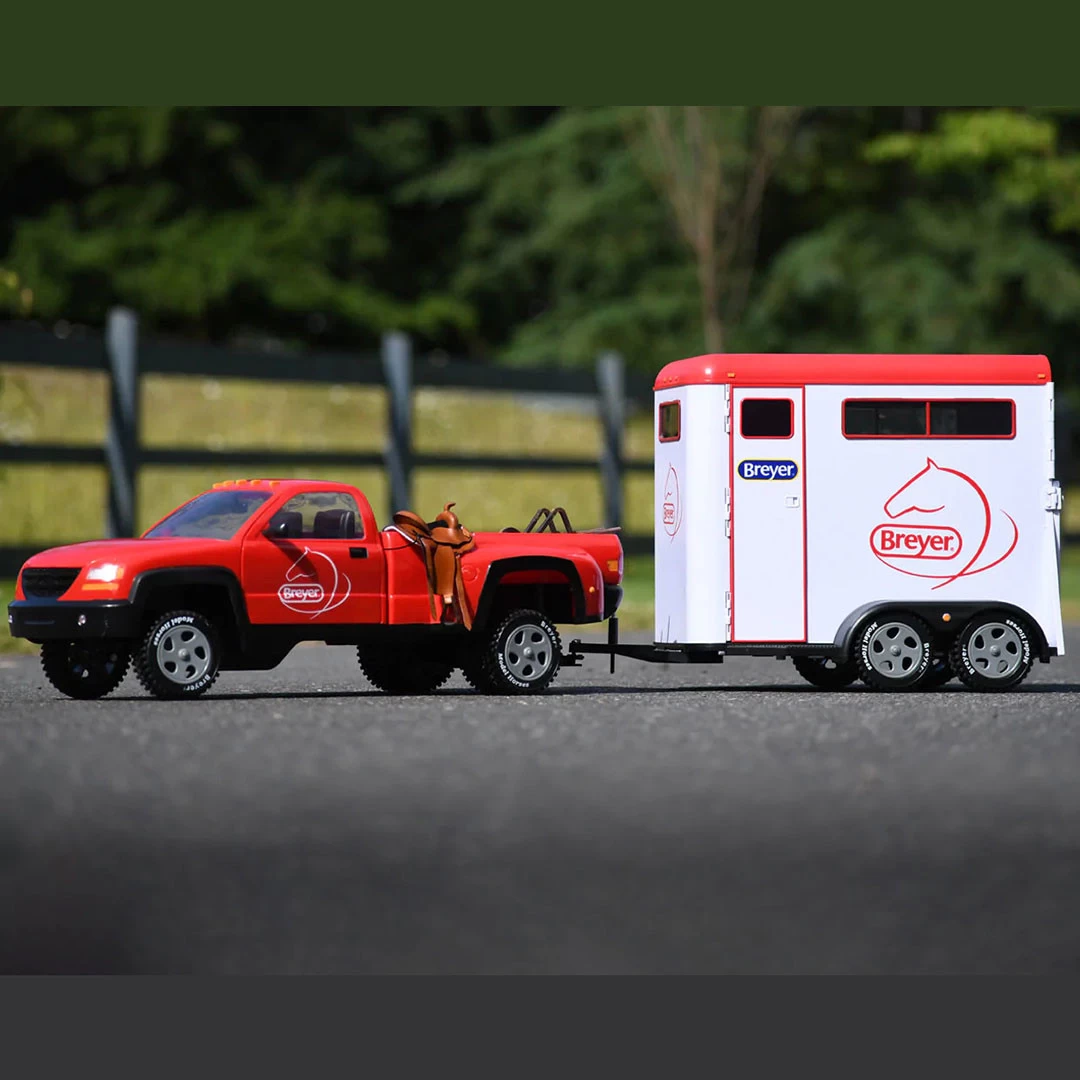 Breyer’s “Dually” (for dual-wheeled) Truck hitches up to the matching Horse Trailer in a snap! Beautifully crafted, this super truck has room inside for two Breyer 8″ figures.