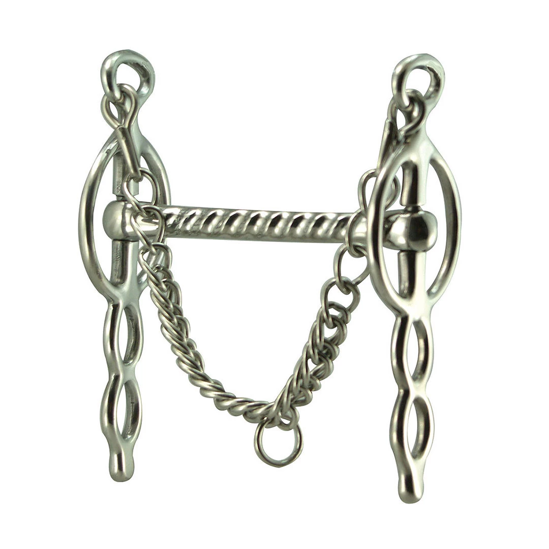 This driving bit has a straight serrated mouth piece and two slots. The Liverpool Bit is a curb or leverage bit. The further down the shanks the reins are attached the more leverage will be applied.