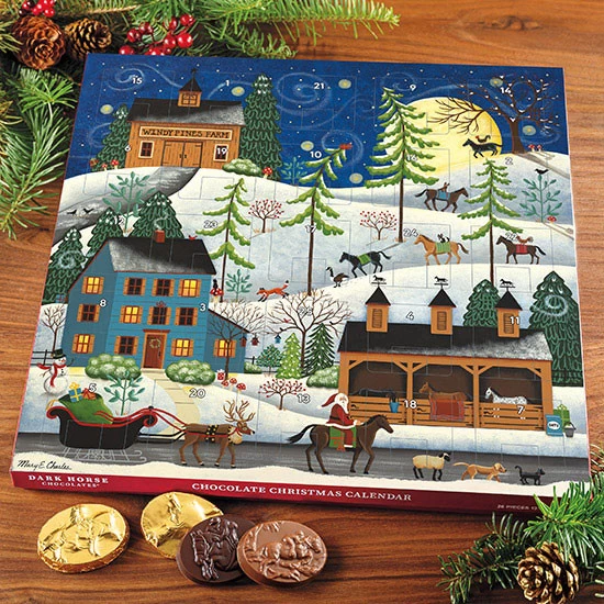 Includes 26 Dark Horse Chocolates individually foil wrapped in gold foil nestled behind numbered doors from 1 to 25 leading up to the Christmas holiday. All your favorite dark and milk chocolate Dark Horse Chocolates including Dressage Classics, Peppermint Ponies, Grand Prix Jumpers, Tally Ho, Full Cry, and Fox Trot.