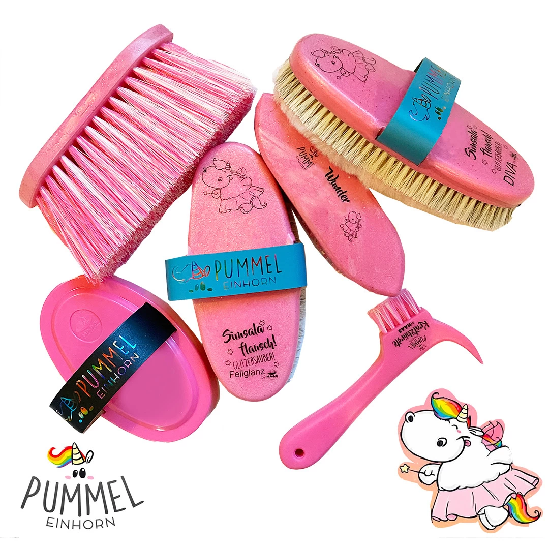 Each brush has a unicorn logo with the words Pummel Einhorn (German for Roly-Poly Unicorn). The pink brushes have a roly-poly fair unicorn with sparkles on the back!