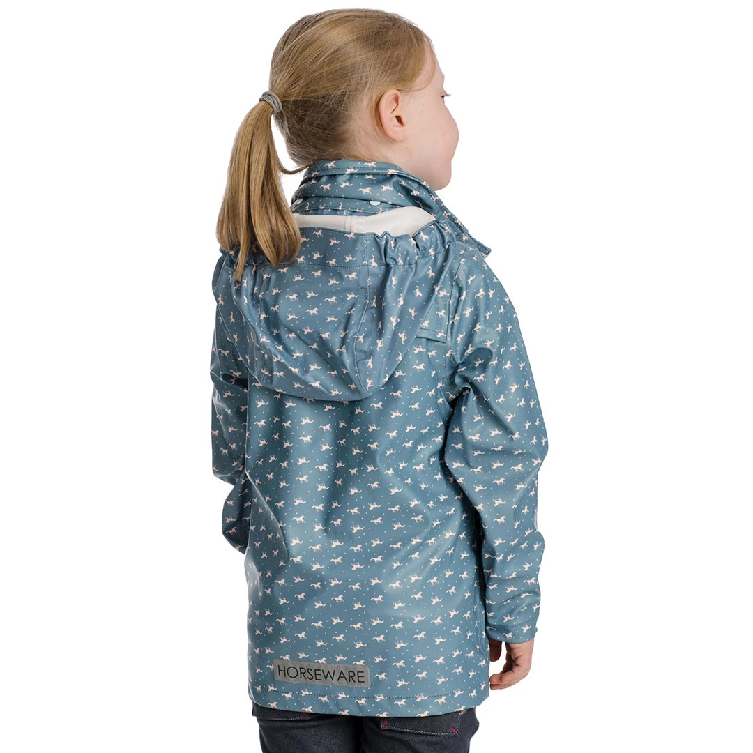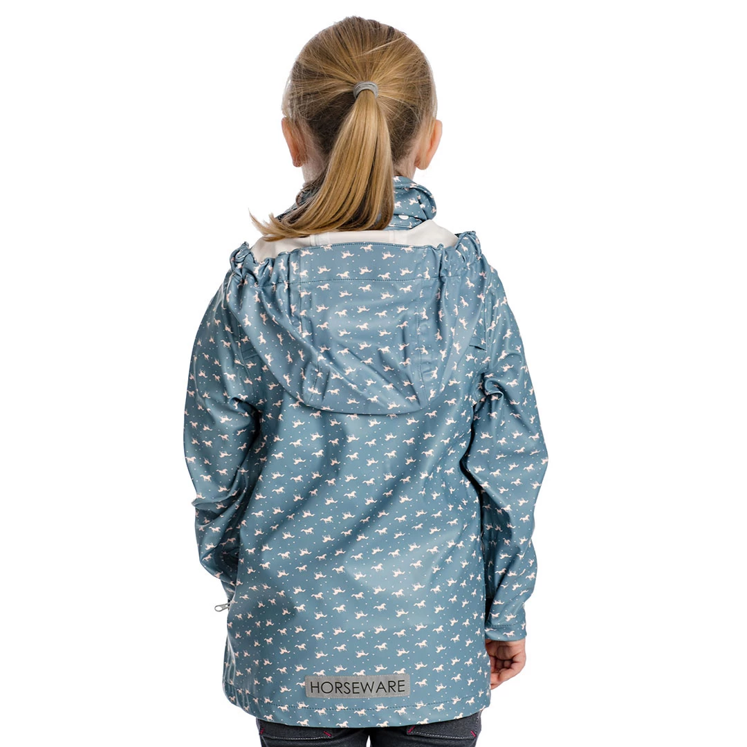 Kids can stay dry with Horseware! This well engineered, waterproof jacket has been created for kids with function and fashion in mind. Tiny ponies are cantering across the blue coat.
