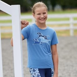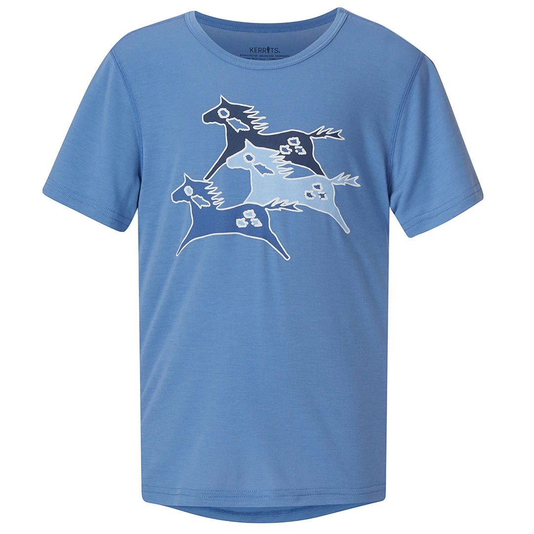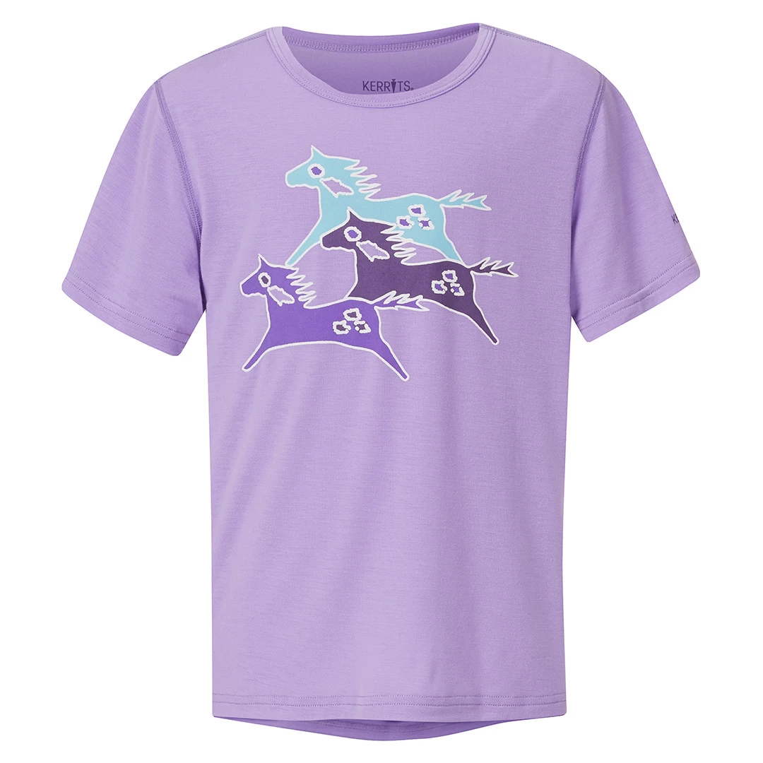 Kids with ponies galloping through their dreams will adore the exclusive three-pony print on this super-soft performance t-shirt, in fun colors that coordinate with their favorite Kerrits tights. The lightweight, stretchy material breathes to keep them cool at the barn and beyond for a durable top that will outlast all their regular t-shirts.