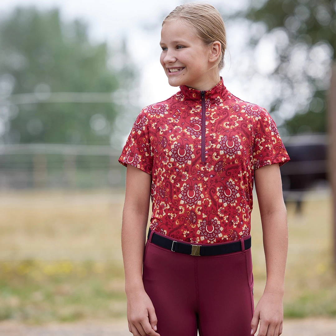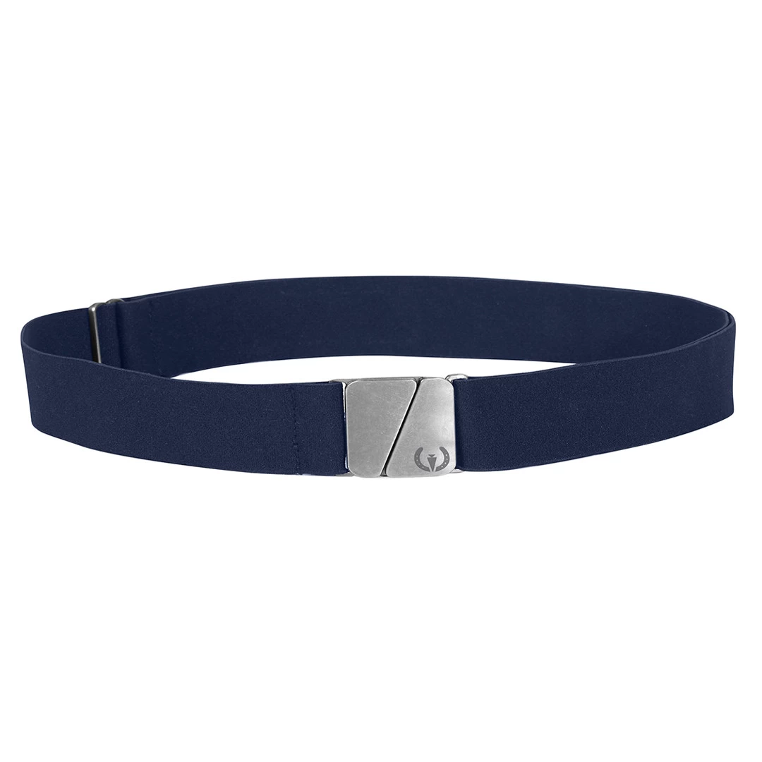 Tie together every look with an infinitely adjustable, stretchy elastic belt. This low profile one-inch belt clasps with a flat, brushed metal square buckle features the Kerrits logo and horseshoe for good luck.