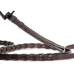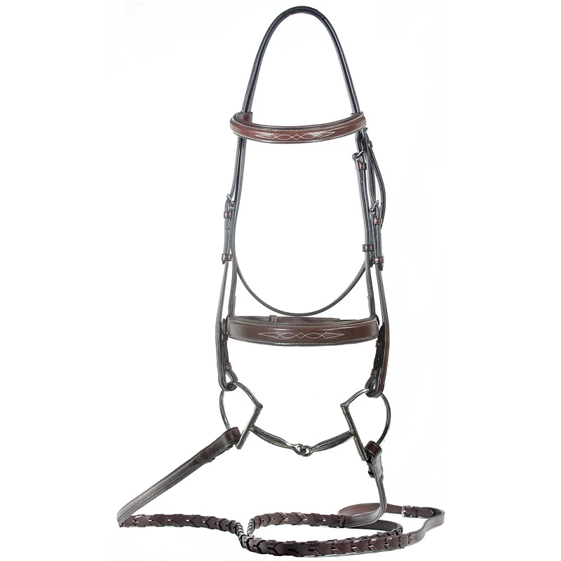 It’s made with the traditional Hunter crown that that doesn’t add bulk around the poll and eliminates the extra caveson buckle on the off side. Includes stainless steel hardware, hook stud closures and fancy-stitched, flat raised laced reins.