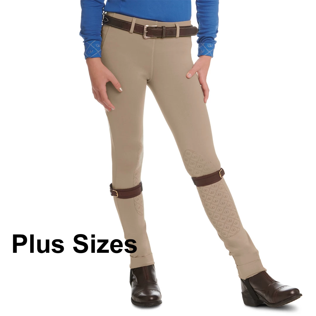 Everyone loves the cool, stretchy feel of these AeroWick Euroseat jods in PLUS sizes. They’re loaded with features including horse shoe pattern silicone knee patches, front pockets, wide belt loops, cuff bottoms and elastic jod straps.