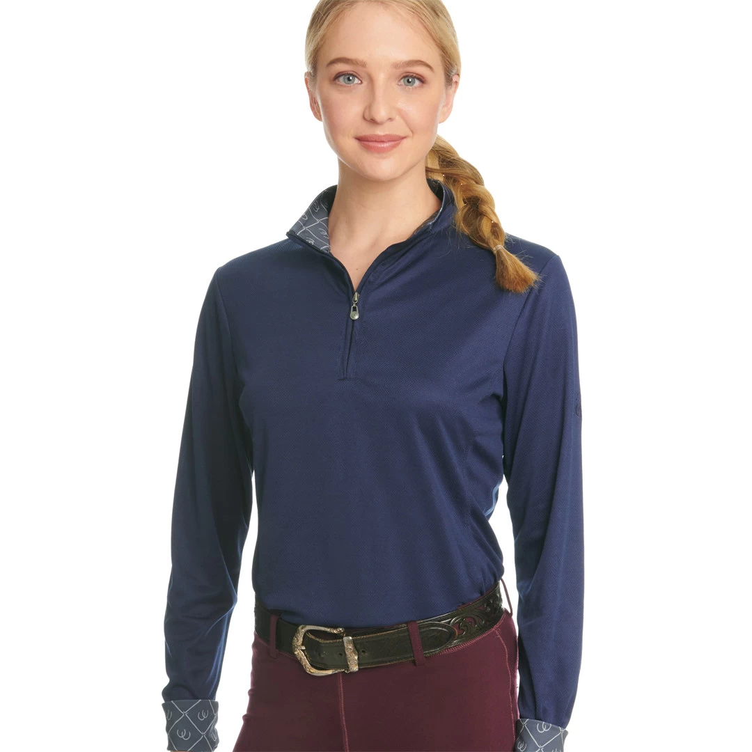 Sheer mesh under sleeves provides an extra cooling effect. Fashionable printed collar and cuffs add a fun touch.