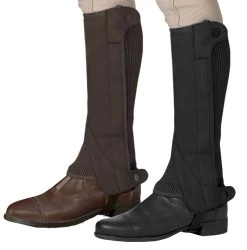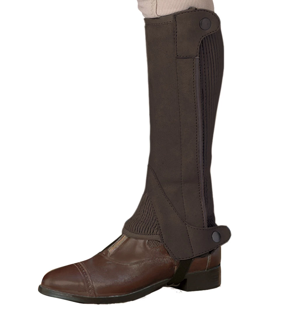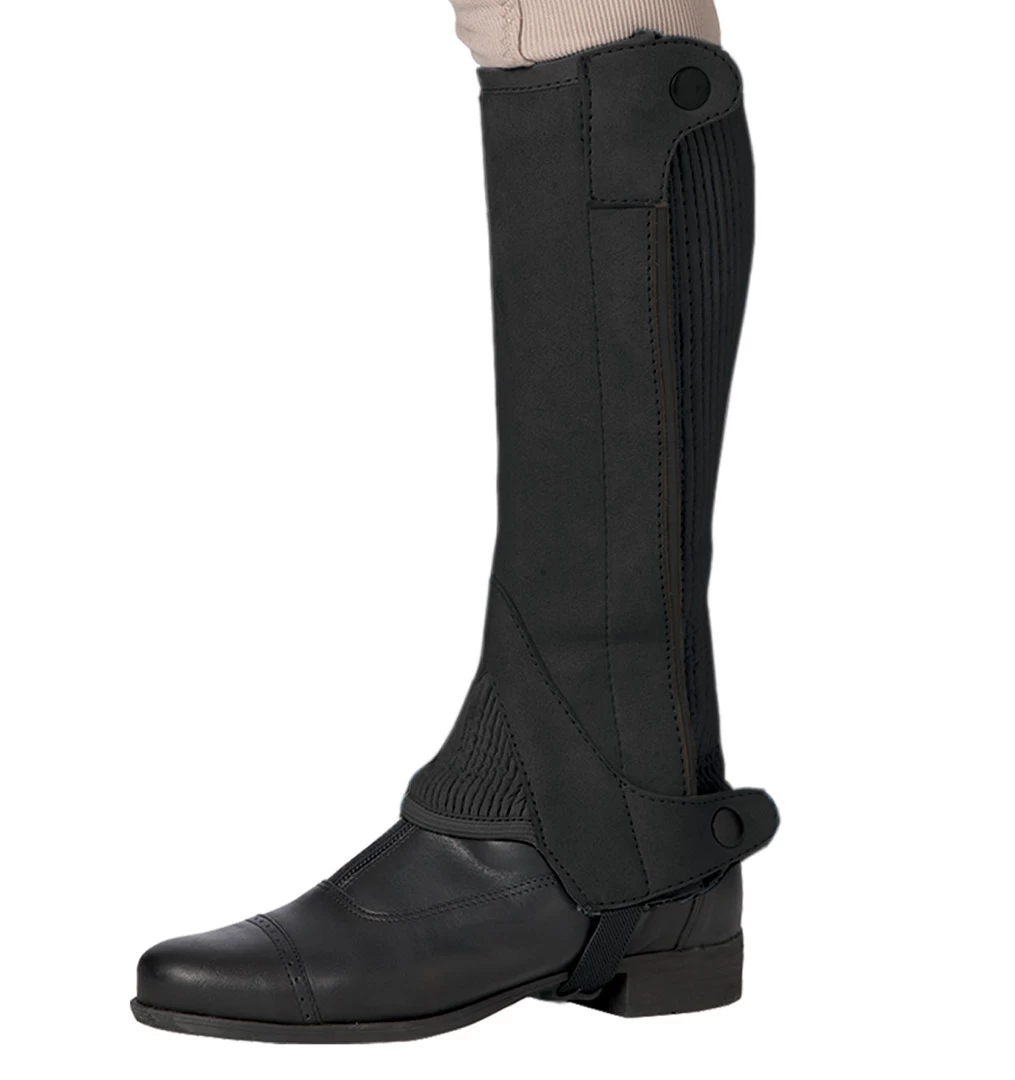 The Ovation Elite Amara Ribbed Half Chaps have a stretch ribbed elastic insert that assures a close, comfortable fit. Other features include prmium YKK zippers, high cut Spanish tops , top and bottom snaps and elastic stirrups.