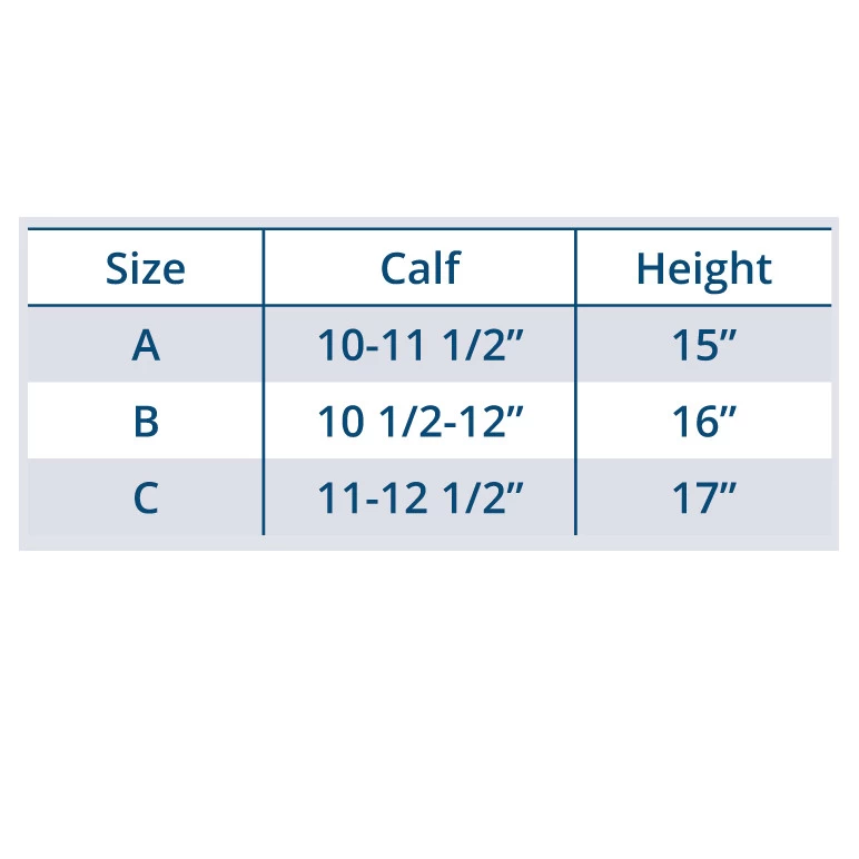 Calf measurement is taken around the widest part of the calf. Length measurement is taken from the back of the knee to the bottom of the chap.
