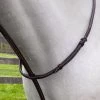 The brown nylon girth has elastic on all buckles for equalizing pressure and also a center D-ring for adding additional training attachments.