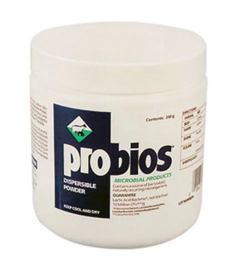 Probios powder is a probiotic supplement for horses that contains guaranteed levels of Lactobacillus plantarum, Enterococcus faecium, Lactobacillus casei, and Lactobacillus acidophilus.