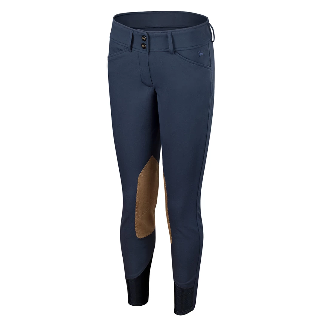 The fabric covered interior waistband and mesh lower leg panels provide ideal comfort. Premium Clarino™ knee patches are naturally supple and breathable while presenting the elegant look of real suede. R.J. details on the front closures and pocket complete the design.