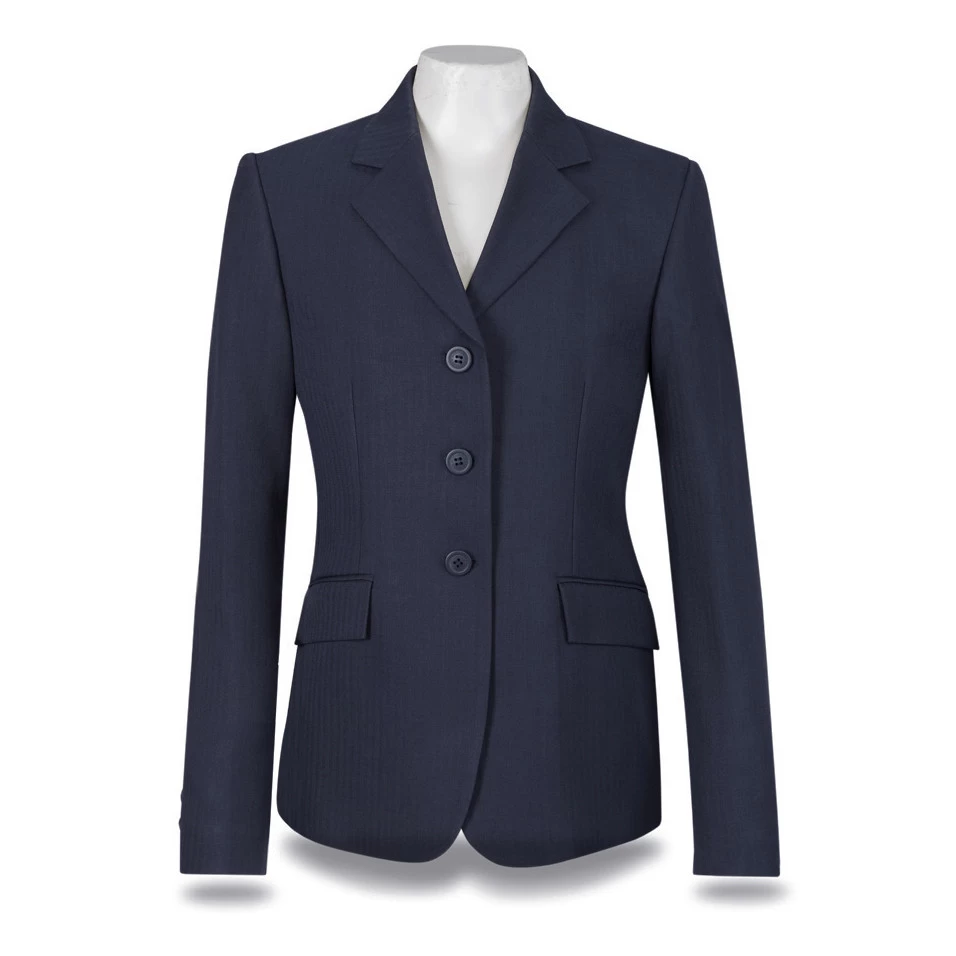 In addition to style and quality, you will also have added convenience with this navy herringbone show coat. This garment contains all washable ingredients which mean you can throw it right in the washing machine! It features the same traditional styling as R.J.’s other show coats with two front pockets and double vented back.