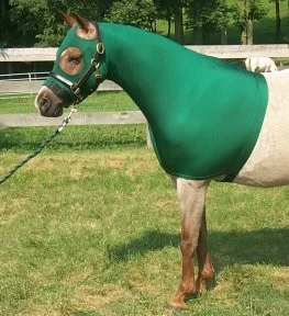 Lycra Sleazies are super stretchy and comfortable. They are fully hemmed with elastic and are sewn with high strength industrial polyester thread and soft wooly nylon next to the ponies skin. The noseband is adjustable and is constructed with a soft 2 inch band of fleece next the face. The no-buckle girth is easy to fasten with wide Velcro on a heavy-duty fully hemmed elastic girth strap. The face is seamless for safety.