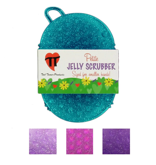 The Tail Tamer Jelly Scrubbers have a great jelly feel and work like a curry. The petite sized scrubbers are sized for smaller hands and will fit kids or women with small hands.