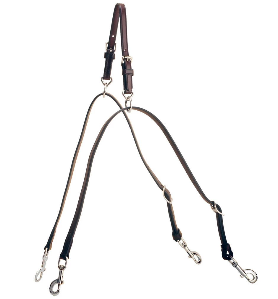 Tory Leather’s Anti-grazing device prevents a pony or horse from dropping its head and grazing. It will fit any bridle. Place device over crown of bridle and snap one end of reins to bit and the other to the dees on the front of the saddle.