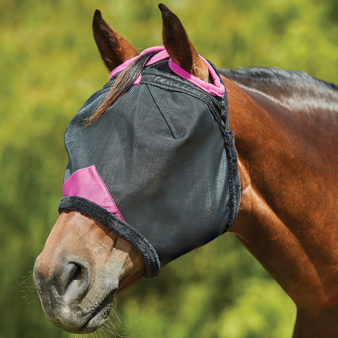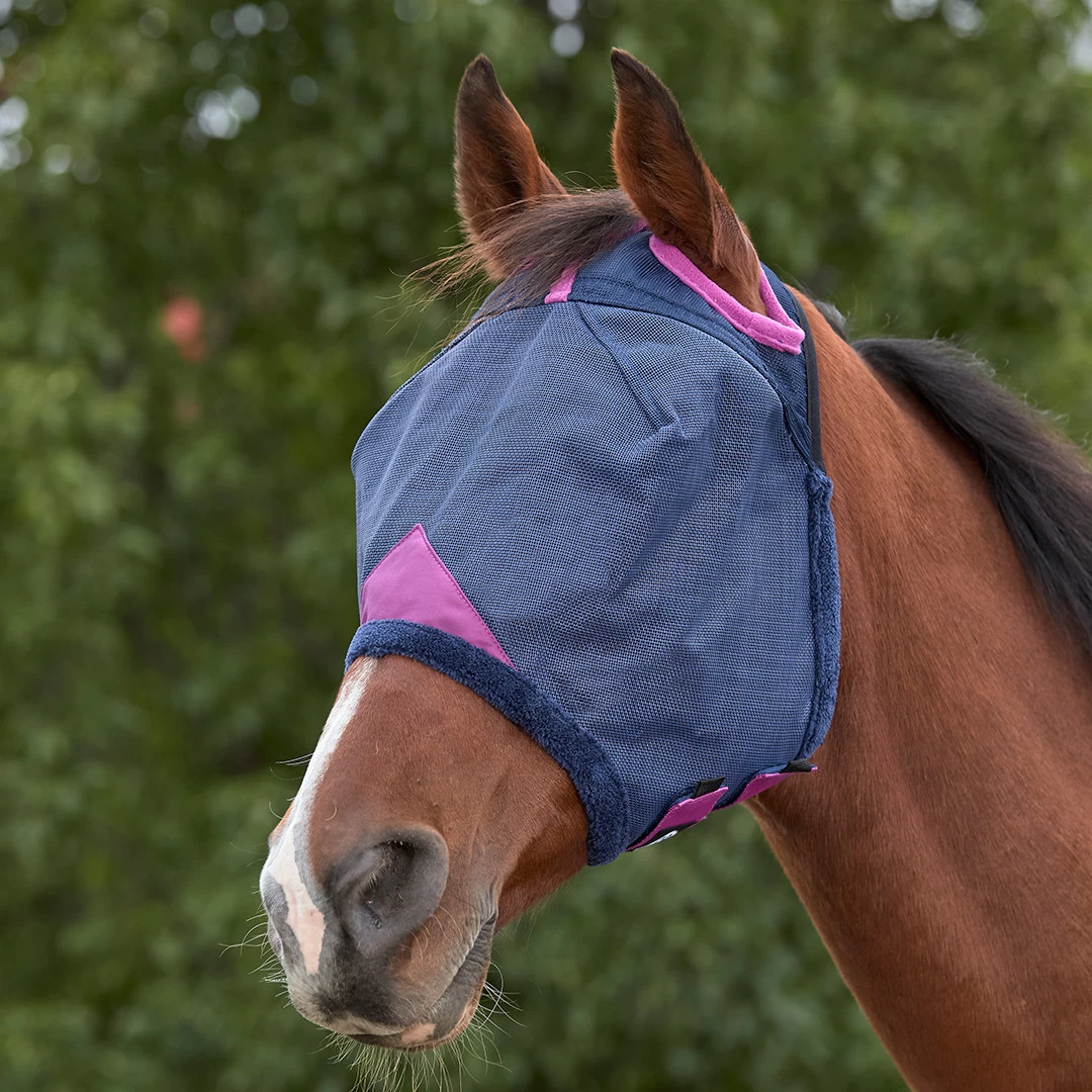 This deluxe mask has mesh that is sturdy and easy to see through with double darts for a superb fit. What sets it apart is a soft fleece binding and hole to pull forelock through for additional comfort.