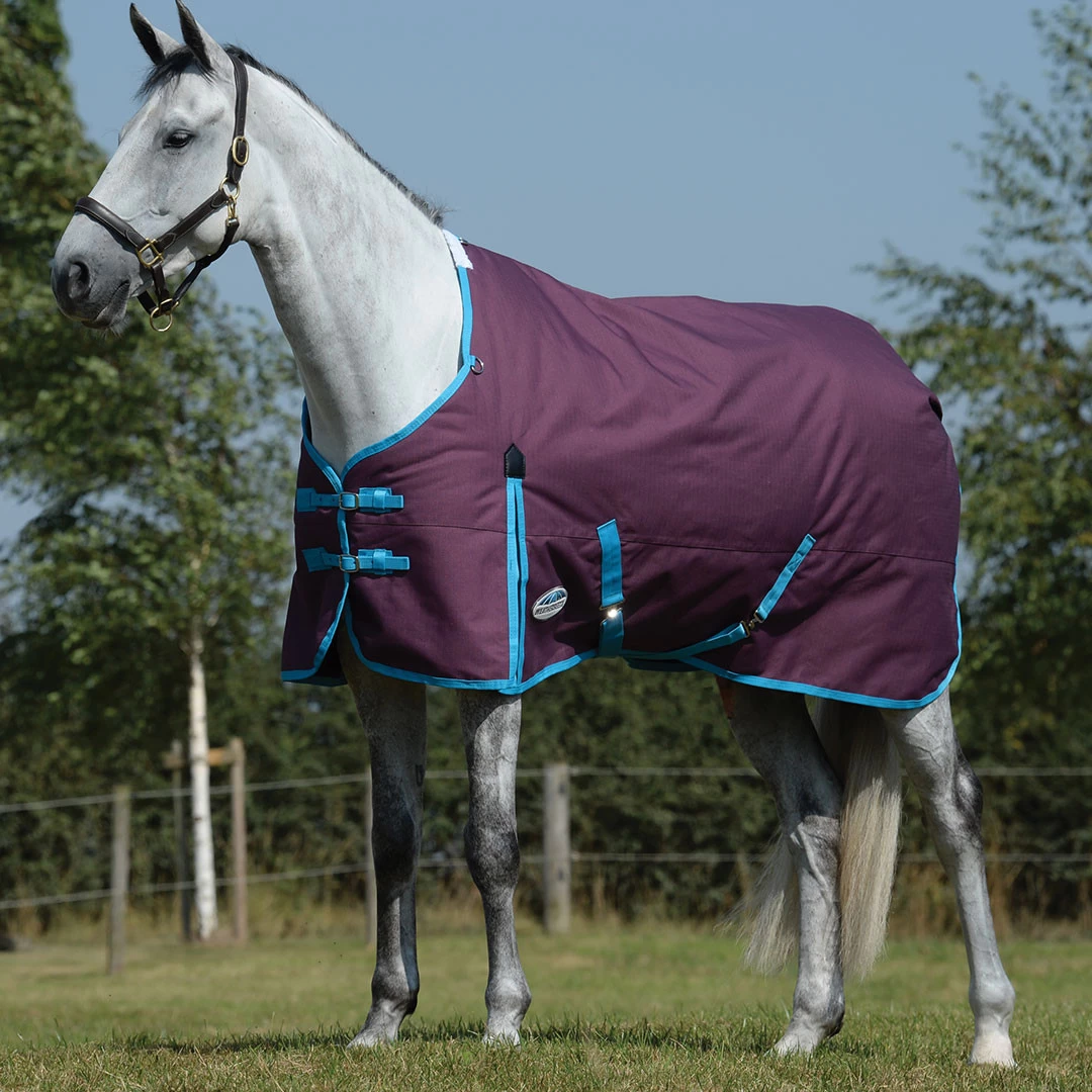 It has a strong and durable 1200 denier ripstop outer shell with repel shell coating that’s both waterproof and breathable and a warm 220g Polyfill. Other features include a 210 denier Oxford polyester lining, traditional side gussets, twin adjustable buckle front closure, 100% Boa fleece at the wither, adjustable & removable leg straps, twin low cross surcingles and a tail flap.